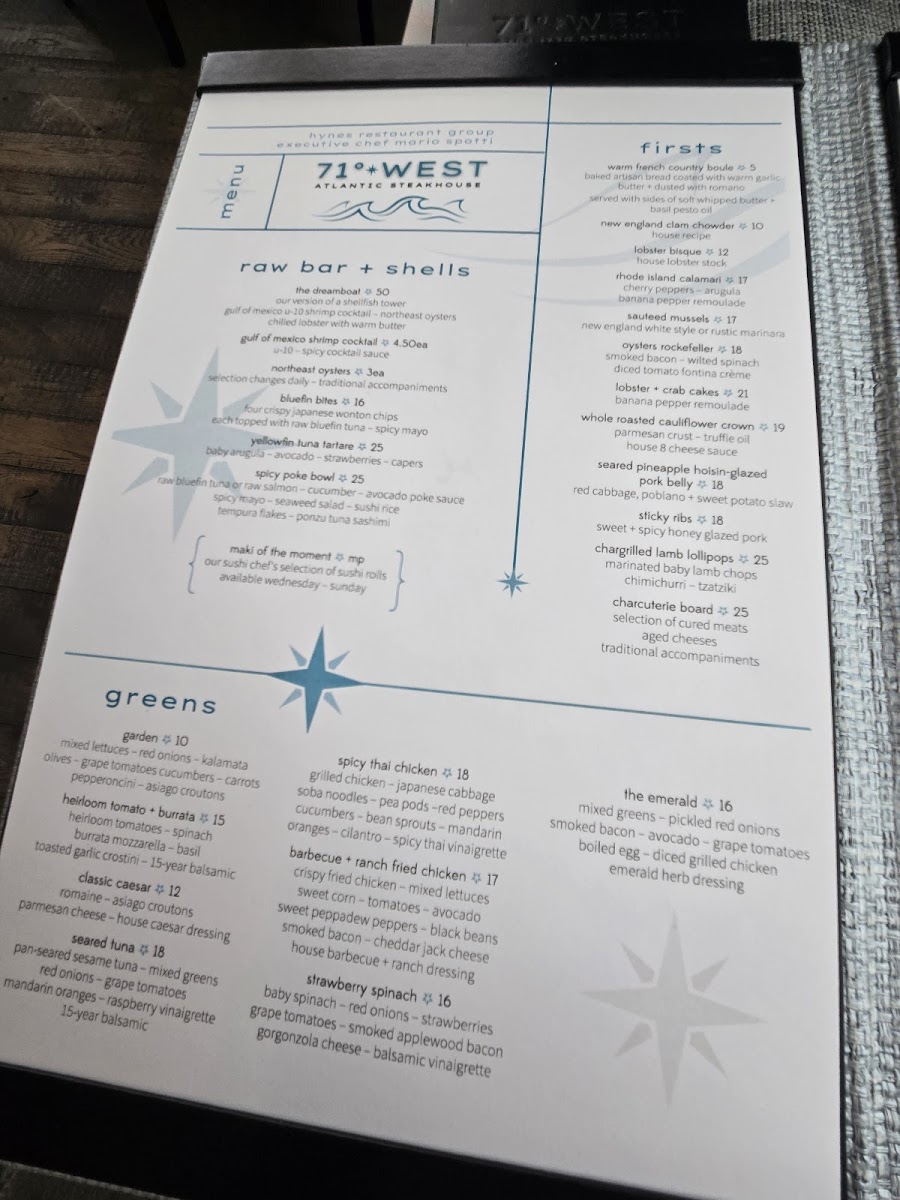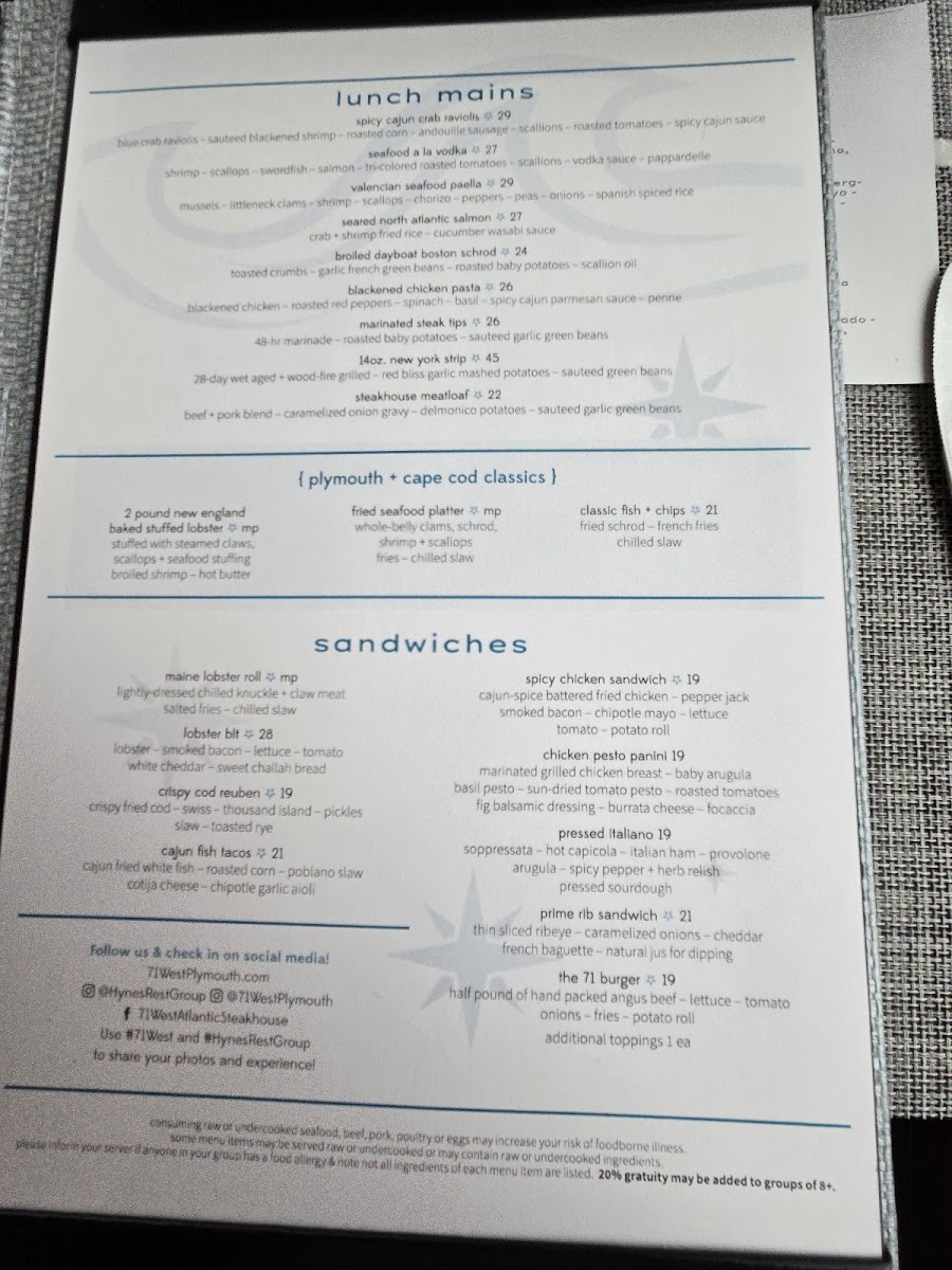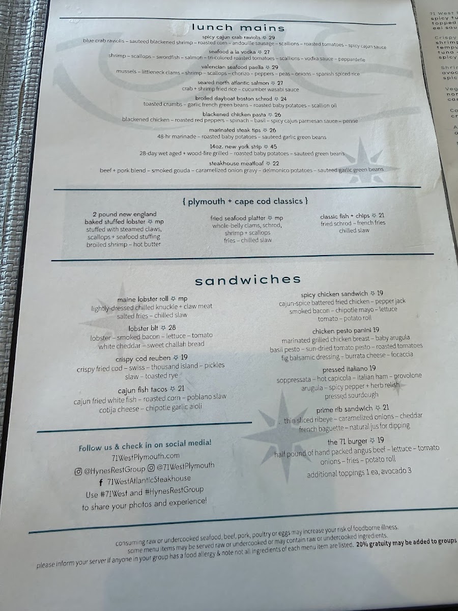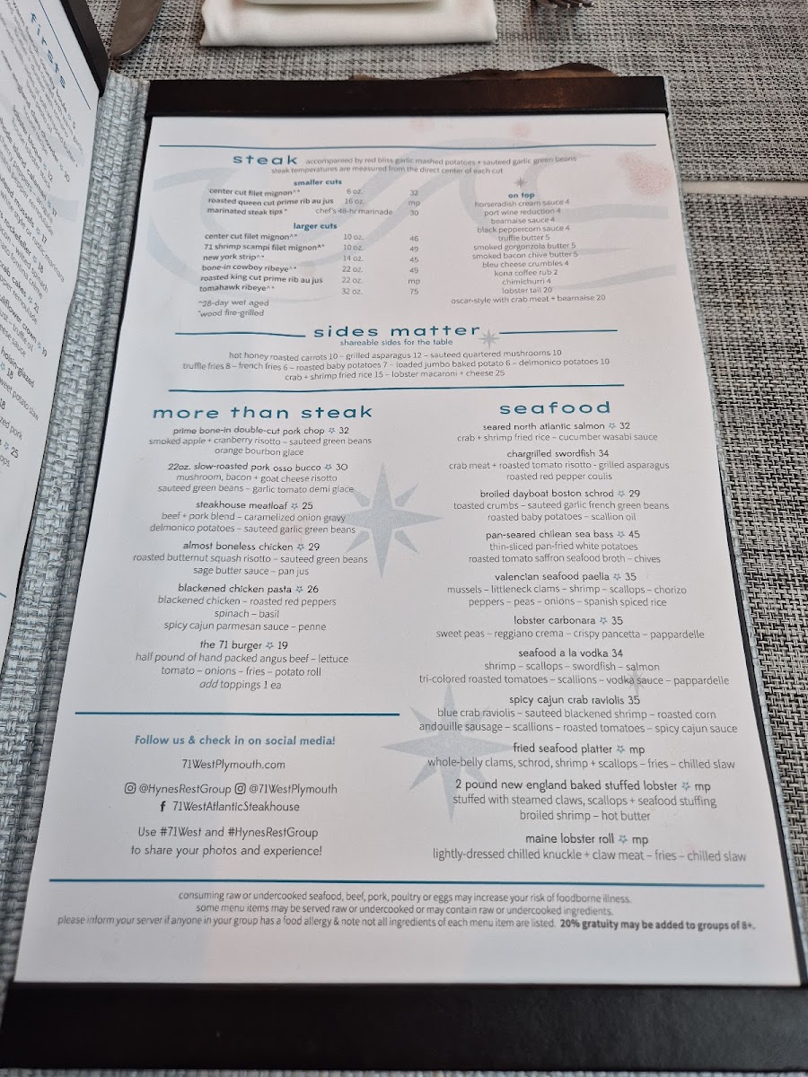 The 71 West Atlantic Steakhouse Menu offers a delightful dining experience right in the heart of Plymouth. Located in the rear building at 114 Water St, on the second floor, this spot invites you to enjoy a mouthwatering selection of steaks, seafood, and more, all served in a cozy, intimate atmosphere. Whether you're here for a special occasion or just a casual meal, you'll find something to satisfy every craving. The menu features tender cuts of perfectly cooked steak, fresh seafood dishes, and savory sides that are sure to please. With every bite, you'll experience the care and quality that goes into each dish, making it a favorite for both locals and visitors alike. The view of the harbor adds the perfect touch to your meal, making the whole dining experience even more memorable.